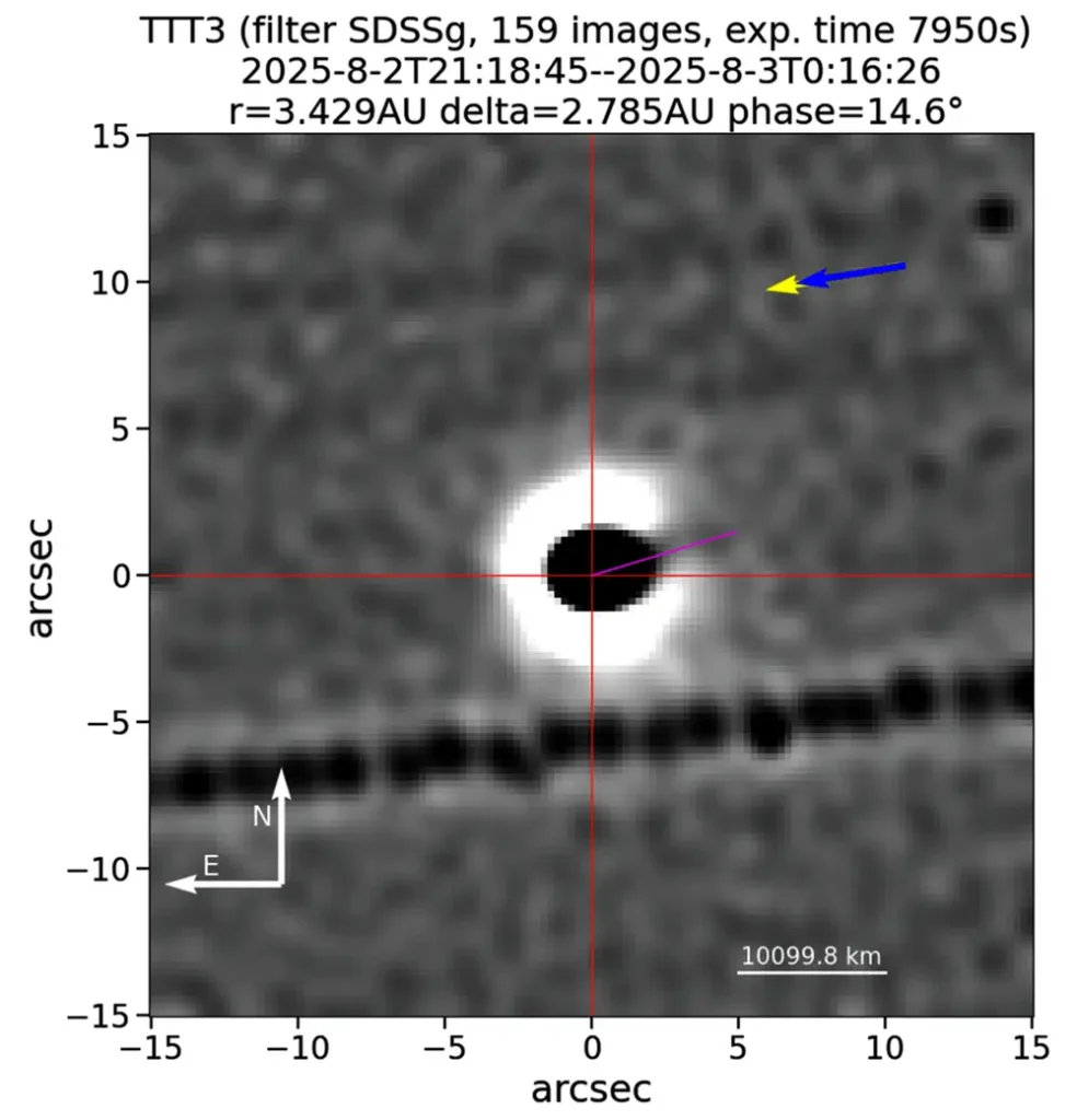 avec barre d’échelle et flèches de direction. Les flèches jaunes et vertes marquent, respectivement, le vecteur de vitesse héliocentrique négatif projeté et la direction antisolaire projetée. Notez que la plus grande partie de la poussière se trouve au soleil du noyau. Source : https://doi.org/10.3847/2041-8213/adf8d8