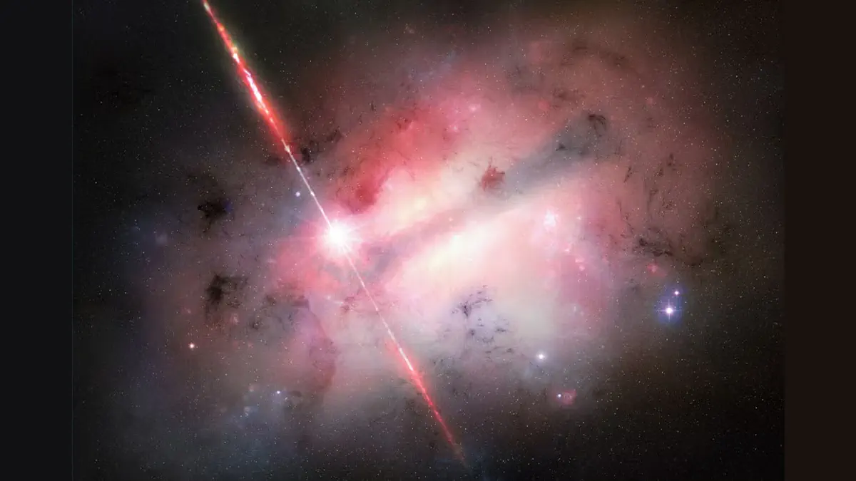 Cette paire de trous noirs constitue le quasar OJ 287, le centre d’une galaxie située à environ 3,5 milliards d’années-lumière de la Terre. OJ 287 a déconcerté les observateurs pendant plus d’un siècle avec son cycle régulier de luminosité et d’obscurcissement. Finalement, les chercheurs ont émis l’hypothèse qu’une paire de trous noirs pourrait expliquer le phénomène. Lorsque le plus petit orbite, il perturbe le nuage de gaz et de poussière entourant le plus grand, créant des éclairs lumineux.