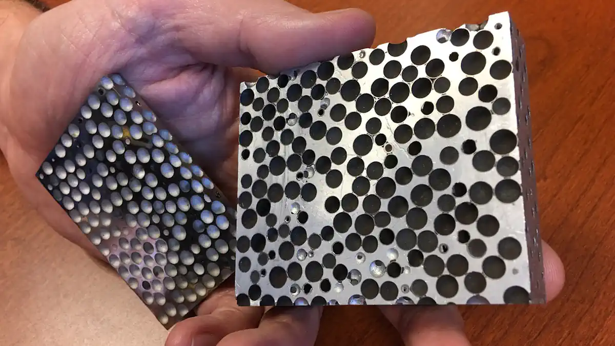 Les CMF sont des mousses composées de sphères creuses, fabriquées à partir de matériaux tels que l’acier inoxydable, le nickel ou d’autres métaux et alliages, intégrées dans une matrice métallique. Le matériau obtenu est à la fois léger et remarquablement résistant à l’absorption des forces de compression, avec des applications potentielles allant des ailes d’avion aux blindages de véhicules et aux gilets pare-balles.