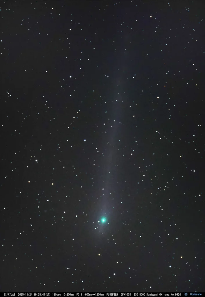 Une incroyable photographie de la comète 3I/Atlas prise avec un objectif Vixen R200SS Collector PH, D = 200 mm, fl = 600 mm, F3, recadré à 1 200 mm équivalent, Fujifilm Grand Format GFX100S, plage dynamique de 400 %, ISO 8000, exposition de 120 secondes, prise de vue unique. Le site d’observation est le village de Kunigami, au nord d’Okinawa (Japon), une zone réputée pour sa faible pollution lumineuse (comme au parc forestier de Kunigami).
