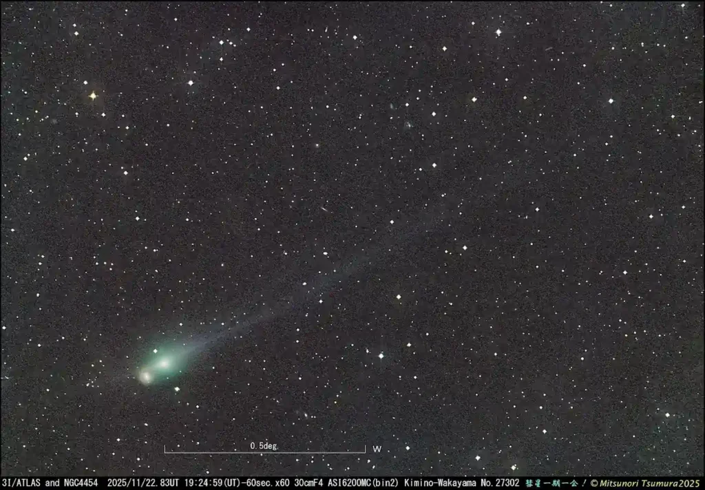 Il y a également cette magnifique photographie prise par Mitsunori Tsumura le 22 novembre avec un télescope de 0,5 mètre qui révèle une queue de 5 millions de km et une anti-queue faisant face au Soleil atteignant 1 million de km. Ce troisième cliché pris depuis la ville de Kimino dans la préfecture de Wakayama au Japon, un autre site réputé pour son ciel sombre, est sans doute le plus spectaculaire de la série, car il capture un moment de rapprochement visuel entre la comète et une galaxie lointaine.