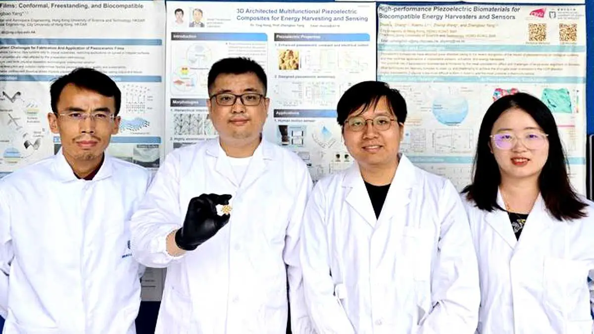 Légende illustration : (YANG Zhengbao, professeur associé de génie mécanique et aérospatial à la HKUST, avec les membres de son équipe de recherche, le Dr HONG Ying, le Dr LIU Shiyuan et le Dr YANG Xiaodan. Crédit HKUST
