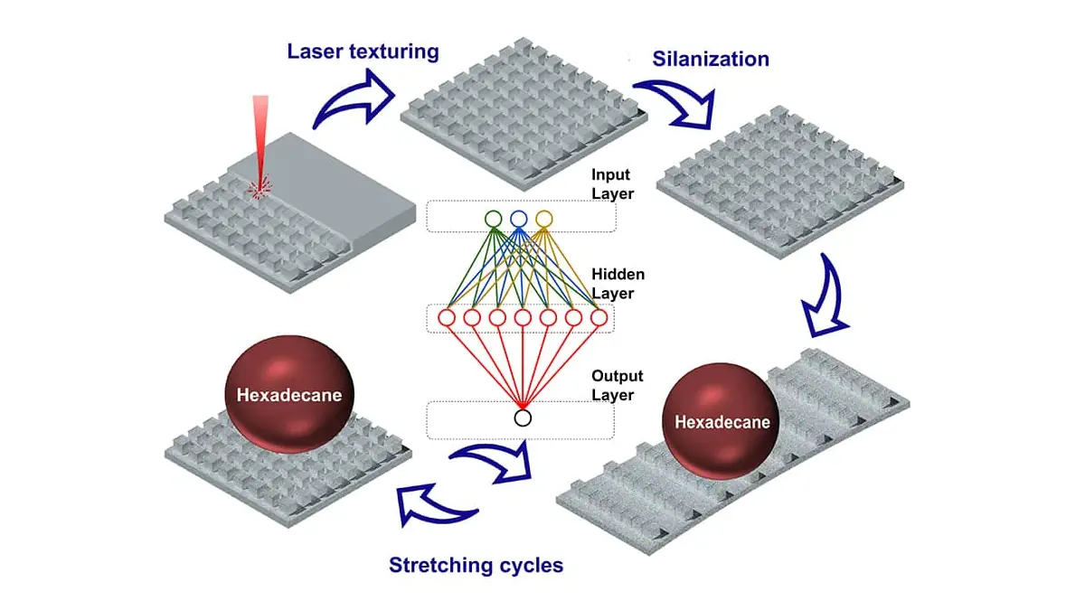 Un cadre d’apprentissage automatique a reçu ces trois paramètres importants ainsi que l’angle de glissement souhaité du matériau – qui indique la facilité avec laquelle les liquides glissent sur une surface – pour déterminer la technique d’ablation laser optimale, éliminant ainsi le besoin de tests longs et fastidieux par essais et erreurs.