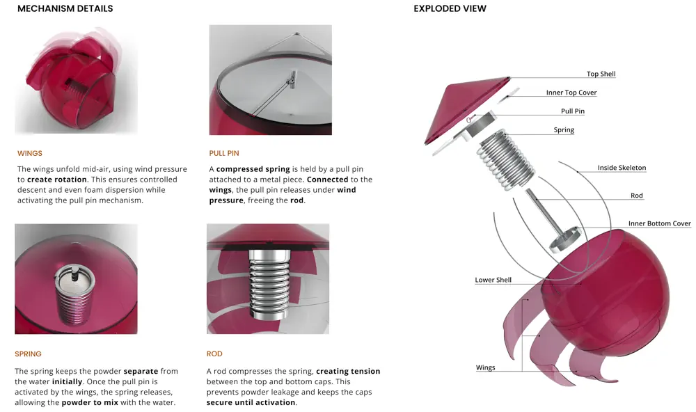 À l’intérieur, un piston à ressort maintient séparés un agent chimique sec et un liquide activateur. Dès que l’air ouvre complètement les ailes, un pion de verrouillage se détache ; le ressort propulse alors la poudre dans la chambre liquide. Le mélange déclenche une réaction « hyper-volumétrique » qui, en quelques secondes, fait exploser l’enveloppe en PHA (un plastique biodégradable) et libère la mousse ignifuge sur la végétation.
