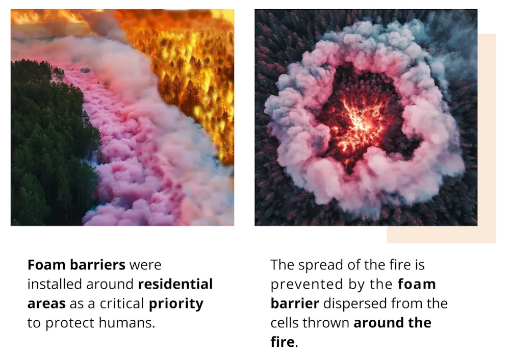 Dans leur fiche projet, ils soulignent : « au lieu de lutter contre l’incendie, nous devons contenir sa propagation. » Concrètement, leur approche consiste à projeter la mousse en amont du front de flammes pour empêcher toute propagation, un changement de paradigme qui pourrait se résumer ainsi : « Elle ne combat pas le feu là où il se trouve, mais le circonscrit stratégiquement là où il se trouvera, ce qui modifie fondamentalement l’approche de la suppression à celle du confinement. »