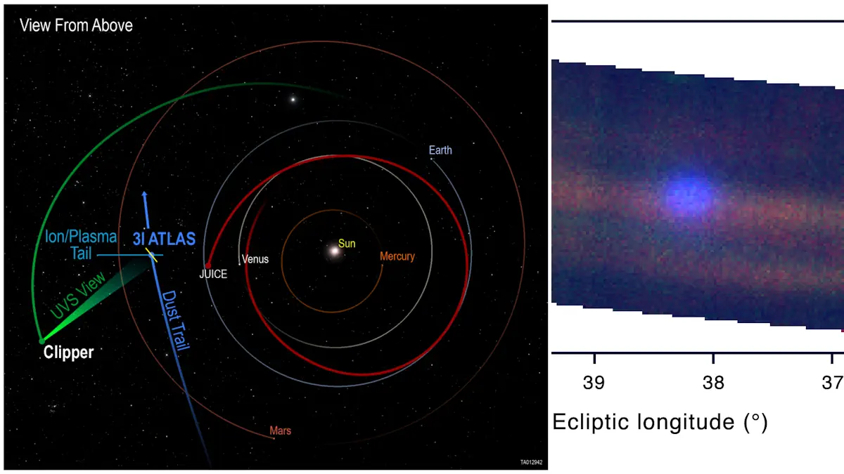 Durant cette période, Europa Clipper a comblé le fossé entre les vues depuis Mars fin septembre et les observations ultérieures depuis la Terre. Avec la trajectoire de la comète passant entre Europa Clipper et le Soleil, son point de vue a permis à l’équipe UVS d’observer la comète sous un angle unique. Les comètes possèdent à la fois des queues de poussière dans la direction de leur sillage et des queues de plasma dans la direction opposée au Soleil.