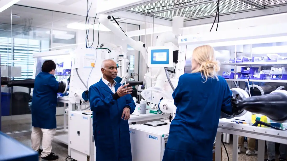 Légende illustration : Arumugam Manthiram, professeur de génie mécanique, s’entretient avec des étudiants dans son laboratoire de batteries situé dans le bâtiment Gary L. Thomas de l’université du Texas à Austin.