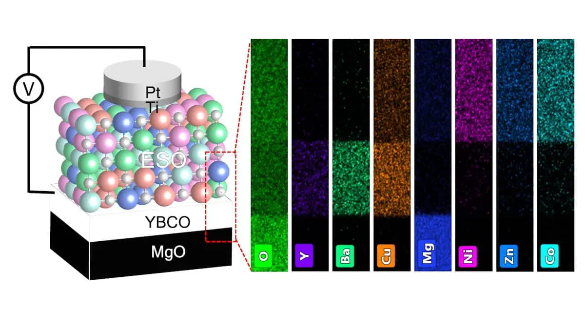 Ces puces intègrent des composants appelés memristors – contraction de «memory resistors». La plupart des memristors sont fabriqués à partir d’un système matériel simple composé de deux éléments, mais ceux de cette étude utilisent un nouveau système matériel connu sous le nom d’oxydes stabilisés par l’entropie (ESO). Plus d’une demi-douzaine d’éléments composent les ESO, permettant de régler finement leurs capacités de mémoire.