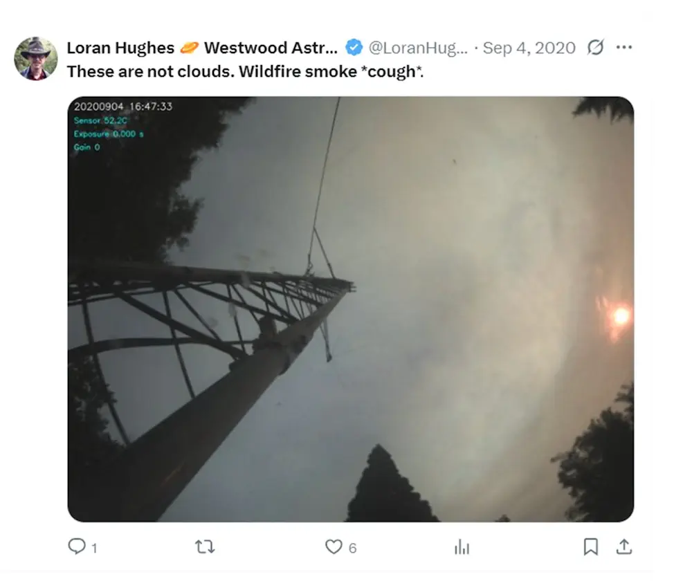 Un après-midi de septembre 2020, Loran Hughes a remarqué un panache inquiétant se former dans le ciel du sud-ouest de l’Oregon, enveloppant le soleil dans l’obscurité. Cet astrophotographe amateur de 62 ans, qui souffrait d’une insuffisance pulmonaire, a publié une image prise par sa caméra astronomique et a envoyé un tweet (ci-dessous).