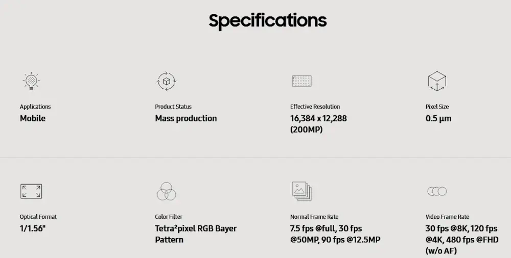 La technologie Tetra²pixel permet également au capteur de fusionner les pixels adjacents selon les conditions d’éclairage, fonctionnant à 50 millions de pixels de 1,0 µm ou à 12,5 millions de pixels de 2,0 µm en faible luminosité. La capacité obtenue offre un zoom intégré au capteur de facteur 2x, qui atteint 6x lorsqu’il est associé à un téléobjectif 3x. Le capteur enregistre en 4K à 120 images par seconde et en 8K à 30 fps.