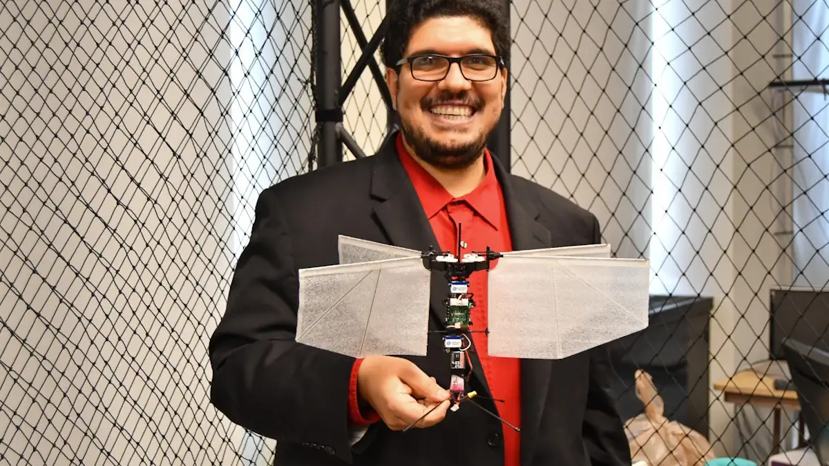 Ahmed Elgohary et l’étudiant diplômé de l’UC Rohan Palanikumar ont utilisé une télécommande pour démontrer comment le drone à ailes battantes vole dans le laboratoire de vol d’Eisa, qui est entouré d’un filet souple pour protéger à la fois les drones et les personnes des collisions accidentelles. Le drone a quatre « ailes » faites de fil et de tissu.