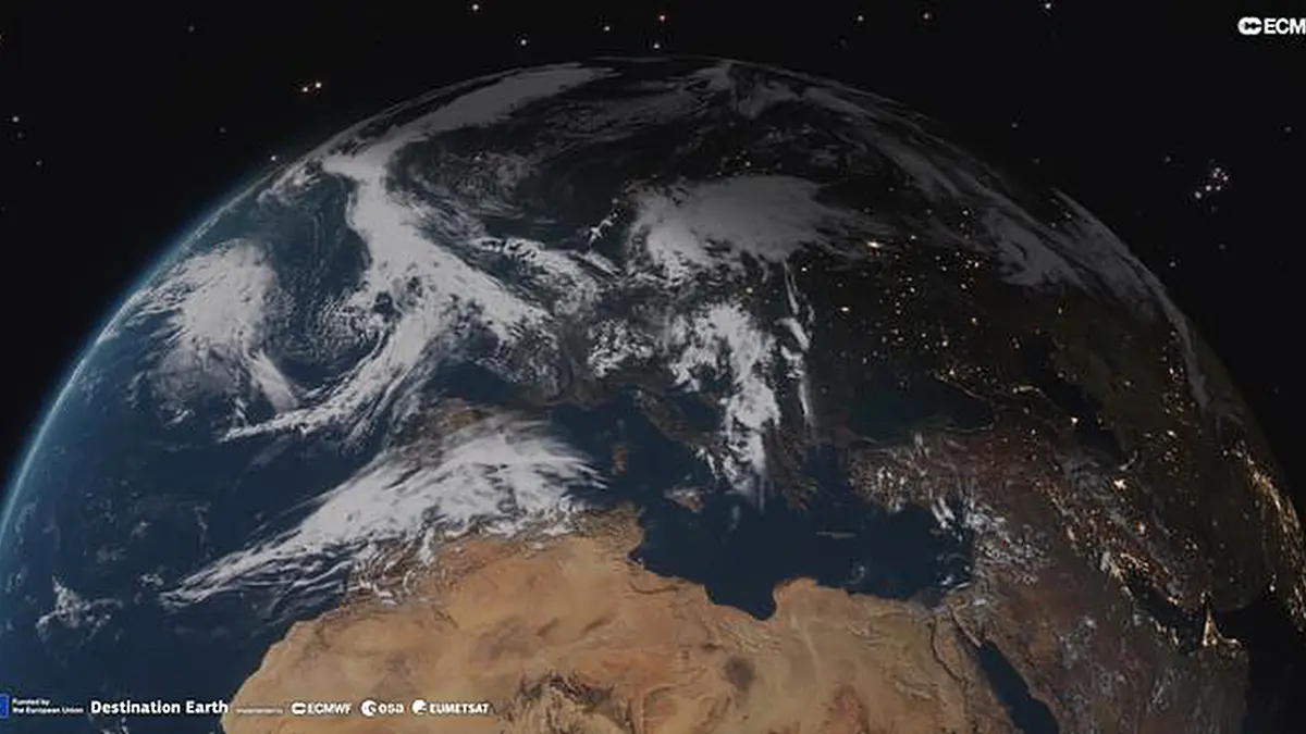 Destination Earth est une initiative financée par l’Union européenne lancée en 2022, visant à construire une réplique numérique du système terrestre d’ici 2030. L’initiative est mise en œuvre conjointement par trois entités mandatées : le Centre européen pour les prévisions météorologiques à moyen terme (ECMWF), responsable de la création des deux premiers jumeaux numériques et du Moteur de jumeau numérique, l’Agence spatiale européenne (ESA), responsable de la construction de la Plateforme de services de base, et l’Organisation européenne pour l’exploitation de satellites météorologiques (EUMETSAT), responsable de la création du « lac de données ».