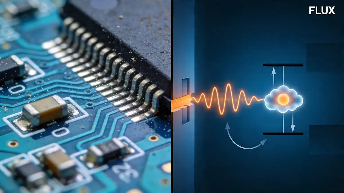 puce en gros plan où un seul électron « frappe » le silicium à l’interface Si/SiO₂, Crédit : GenAI