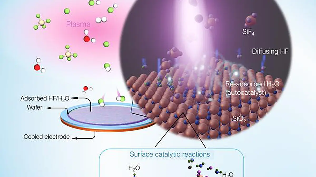 Les chercheurs ont refroidi le substrat semi-conducteur à −60°C puis l’ont exposé à un plasma HF. Ils ont observé que le HF et l’H₂O s’adsorbaient tous deux sur la surface de SiO₂ et ont constaté que l’H₂O agit comme un catalyseur, réduisant la barrière d’activation de la gravure à presque zéro.