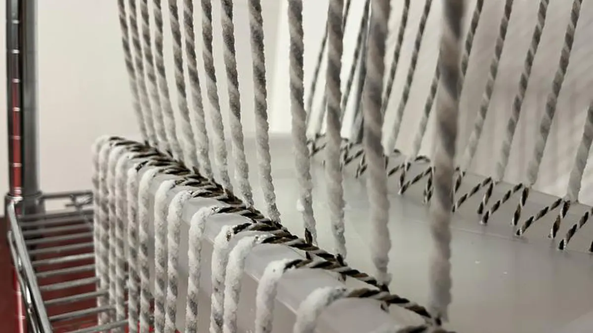 Le concept qu’il a imaginé utilise de longs brins de fibre de polypropylène — essentiellement de la ficelle. Une extrémité de la ficelle est immergée dans une solution d’hydroxyde de potassium, qui est lentement aspirée par capillarité dans les fibres.