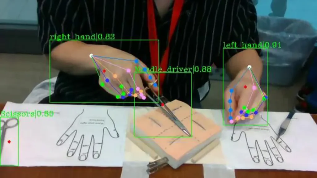 L’équipe a entraîné son modèle en suivant les mouvements des mains de chirurgiens experts pendant qu’ils fermaient des incisions. Lorsque les étudiants tentent la même tâche, l’IA leur envoie immédiatement un message pour leur dire comment ils se comparent à un expert et comment affiner leur technique.