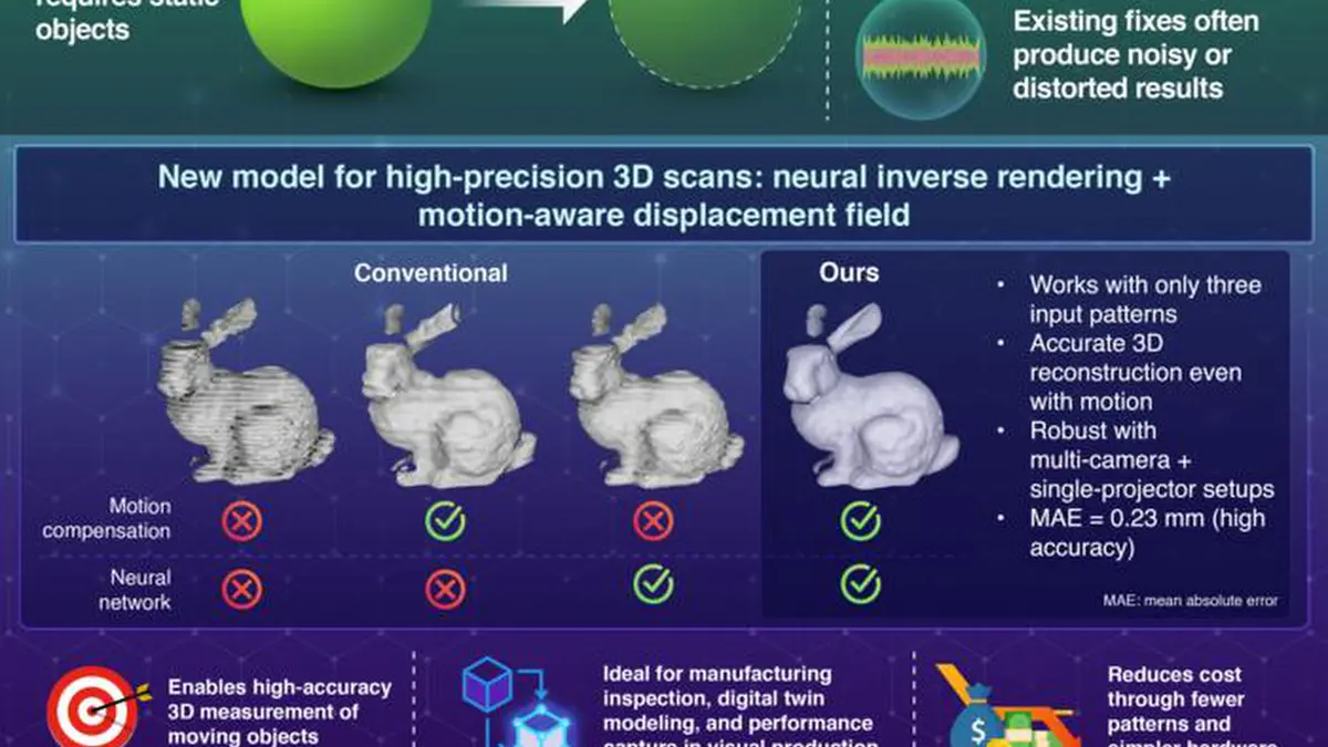Parmi les diverses approches optiques, les méthodes de lumière structurée—qui projettent des motifs sur un objet et analysent la lumière réfléchie pour reconstruire sa forme 3D—sont largement utilisées en raison de leur précision et de leur polyvalence. Cependant, la méthode de déphasage largement adoptée peine lorsque les objets bougent ne serait-ce que légèrement pendant le processus. Par conséquent, les systèmes d’imagerie 3D conventionnels échouent souvent lorsque le mouvement de l’objet provoque des distorsions entre les motifs projetés et capturés, limitant ainsi leurs applications, allant de l’inspection en fabrication et l’archivage du patrimoine culturel à la modélisation de jumeaux numériques et la capture de performance en production visuelle.