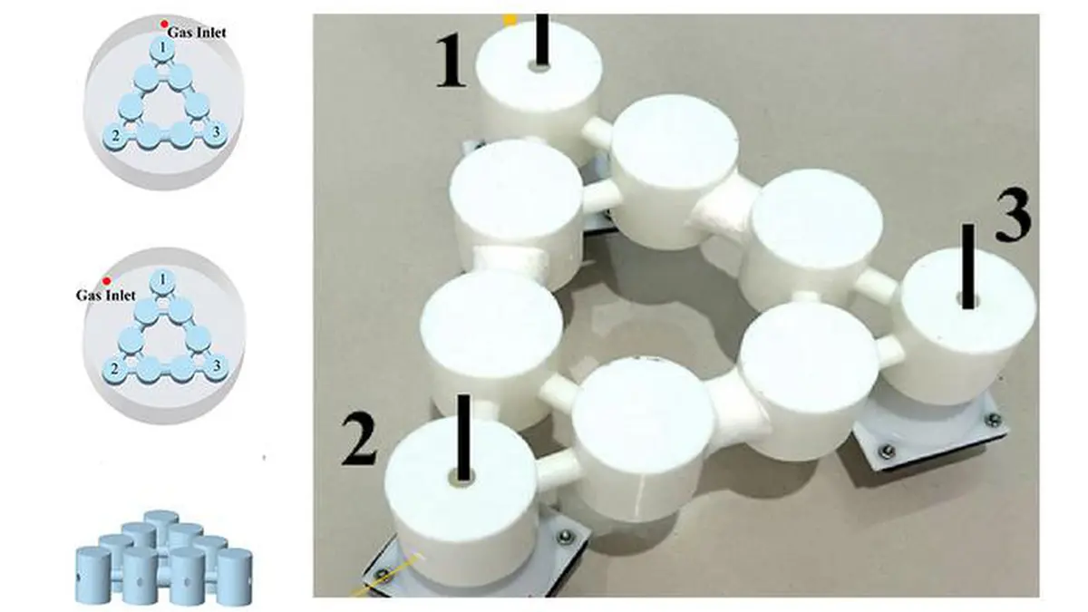 Des haut-parleurs placés sous les cylindres d’angle génèrent des ondes sonores, qui sont localisées au niveau des cylindres d’angle de la structure. Les ondes sonores sont des vibrations qui transportent de l’énergie à travers un milieu, comme l’air ou l’eau. La forme d’une onde sonore détermine sa hauteur, son volume et sa vitesse — également appelée sa fréquence — son amplitude et sa vitesse de propagation. Dans leur dispositif de détection de l’hélium, les chercheurs ont tiré parti de la manière dont la vitesse du son change dans différents milieux.